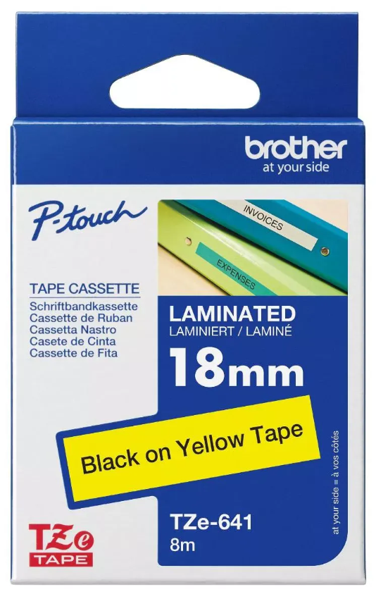 BROTHER เทปพิมพ์อักษร TZE-641 18 มม. สีดำพื้นเหลือง เป็นเทปพิมพ์อักษรชนิดเคลือบพลาสติกที่ทนทานและใช้งานได้ยาวนาน ด้วยพื้นเทปสีเหลืองและตัวอักษรสีดำทำให้อ่านง่ายและโดดเด่น สามารถใช้ติดบนแฟ้ม เอกสาร หรือวัสดุต่างๆ ที่ต้องการความคงทนและชัดเจน เนื้อกาวเหนียวพิเศษช่วยให้ติดแน่นทุกพื้นผิว